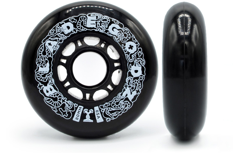The 80/85 MB Blade Godz are the most comfortable wheels we’ve made and the first wheels in our line to use black color technology. A classic size that inspired the first Mushroom Blading experiments of blending slalom, aggressive, and big wheel skating. The 85a hardness performs extremely well on all surfaces for sliding, gripping, and feeling like a blade god. The size can be used on a wide variety of boots and frames, including futuristic skate tools like the PR80 Wizard Frames and the Aeon 80 skate (an aggressive/big wheel hybrid skate like no other). These limited run 80mm wheels are a shortcut to instant joy on skates. Bladegod would approve.