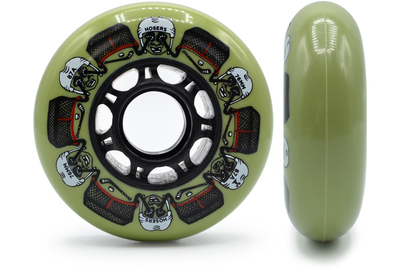 The 76/87 Hosers are the underdog of the big wheel sizes. Fast and smooth like the 80mm Scribbles with the lower ride feeling of the 72mm Faces. Hosers invite you to grab a giant coffee and "just give'r" on your skates, with or without a hockey stick. Great for skating however you want - on flat ground, park, weird street and the outdoor roller hockey rink. Recommended for use on the PR76 Wizard Frames, Marsblades, Roces 1992, Aeon 80s and countless other frames and skates that take 80mm wheels. Be a goon towards your skating terrain, embrace your inner Canadian and breakaway from your grinding obsession on this trusty 87a urethane.