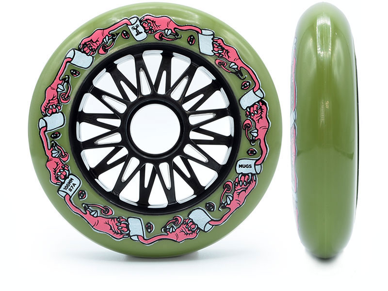 The 100/87 Mugs are meant to be fast, capable and stable while still dropping some hot moves. Originally thought to be a size for speed or distance skaters…. The creation of the NR100 Wizard Frame by Leon Basin in late 2014 (once again) changed what big wheel skating could be. Used heavily in the Wizard Frame Testing series, ZONE, MB7 and MB8. These wheels are a powerful tool in a comfortable 87a hardness for city exploring, flat ground skating, park skating and lengthy slides. This size was the first MB “pro” product and the first “pro” 100mm wheel in rollerblading history. 100mm wheels are absolutely not core and not certified by the Real Skaters Association of the World. We won’t be mad if you skate these on tri skates, but just don’t start yelling, “death to the 4th wheel.”