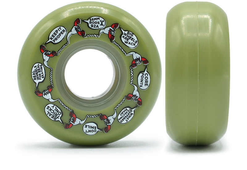 The 56/92 Rods are THE most core wheel in our line. Inspired by the first generation Kryptonics and Senate wheels designed for "aggressive inline skating" in the 90s. The low-riding Rods are meant for real street skating* and real street tricks. With their wide profile and harder urethane Rods can be used anti or flat on a variety of street skating frames for grinding, wheel sliding, toe/heel rolling, pivoting, swivelling and jumping. Extra core points will be rewarded if you don't smile while skating these wheels.