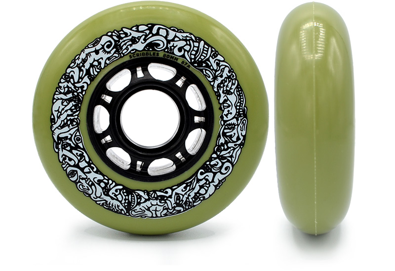 The MB Scribbles are the classic “big wheel” size traditionally used for freestyle, slalom, and freeride skating. This wheel became MB canon during the filming of BIG WHEELS and BIG WHEELS 2, where our first experiments of mixing slalom, aggressive, and big wheel skating began. The 87a hardness is a perfect mix of comfy cruising, grippy turning, and fun sliding. 80mm wheels can be used on various boots and frames including futuristic skate tools like the PR80 Wizard Frame (an incredible flat ground tool) and the Aeon 80 Skate (an aggressive/big wheel hybrid skate like no other). These are your shortcut to fun without being tied down to any specific skating category. So pop them in and scribble with your feet.